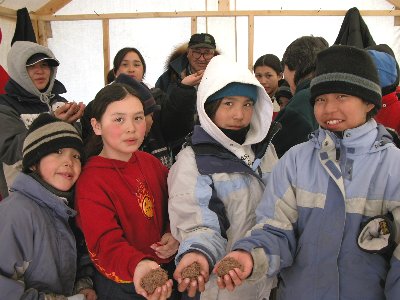 | You begin the process by taking as much sinew and gristle (ch'at) off of caribou meat parts, then you put whatever part you are using into a roasting pan and place in a 350'F oven. Roast the meat pieces for about 2 hours. Let the meat cool off as you prepare the caribou fat. Chop or dice up the caribou fat and place into a frying pan and melt the fat down. While the caribou fat is melting, take your roasted meat pieces and begin the process of pounding it. On a clean tablecloth on the floor, place a round clean rock that will withstand pounding. Sit down on the floor and begin pounding the pieces of meat with the clean blunt end of a small axe. By pounding the meat, this flattens the meat fibers out and the meat falls apart. Keep pounding away until you have small sized meat pieces. Once all your meat is pounded and grounded up, take your hot caribou fat off the stove and pour into your meat mixture. With clean hands mix up the meat and melted caribou fat and form into meatballs. You can add salt flavor if you wish. Lay the meatball pemmican on a clean tray, cover and freeze overnight. When it's time to eat, thaw out just slightly and then enjoy eating this delicious and nutritious snack.